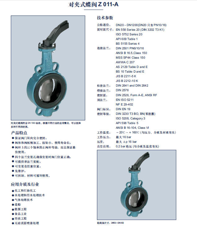 依博羅渦輪蝶閥,EBRO依博羅Z011-A渦輪蝶閥參數,依博羅渦輪蝶閥,EBRO依博羅Z011-A渦輪蝶閥規(guī)格,依博羅渦輪蝶閥,EBRO依博羅Z011-A渦輪蝶閥產品說明 德國依博羅EBRO Z011-A渦輪蝶閥低扭距高耐壓雙面持壓設計,完全隔絕閥體及閥軸與流體接觸,閥瓣與閥軸無銷式設計,方便維修與拆換。 設計規(guī)范: 閥體型式:Z011-A對夾式、Z014-A多耳式 閥體壁厚:AWWA C504, ASME B 16.34 操作器銜接法蘭面: ISO 5211 閥門設計&壓力:ISO 5208, AWWA C504, ASME B16.34 面間距:API 609, ISO 5752, AWWA C504(54”-72”) 持壓測試:ISO 5208, AWWA C504(54”-72”) 閥門標記:MSS-SP-25 防爆認證:ATEX 94/9/CE Group II Category 2 GD ABS 設計認證:ABS Steel Vessel Rules 1-1-7/7,4-6-2/5.11 德國依博羅EBRO Z011-A渦輪蝶閥結構特點: 于閥軸內部置入特殊防止卡死之自潤性軸承,杜絕了一般蝶閥無法關閉的問題,其開關循環(huán)壽命可達100,000次以上之可能性。 閥門尺寸DN350mm以下,閥軸是以一個特殊的”Q”型設計裝置于閥體內,則在本體與蝶片間的閥軸可在不使用任何特殊工具下移除掉。 貼心閥門指示器,為了讓客戶可清楚地看到蝶片的開關角度,于直軸型蝶閥閥軸皆有閥門位置指示的設計。 強化閥軸傳動扭力,透過花鍵將閥軸與閥瓣巧妙結合,配合帶動,強化閥軸傳動扭力,減免機械加工破壞閥軸強度。 防結露閥門,可依客戶不同要求制作。